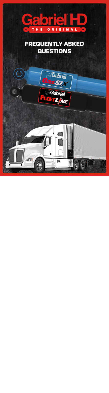 Gabriel® recommends you have your commercial vehicle shocks visually inspected every 15,000 miles and perform the Gabriel Heat Test every 50,000 miles. To do a visual check on your shocks, look for any physical damage to the shock housing, damage to the shock end mounts, or any leaking streaks of oil. Also, inspect your tires for unusual cupping or wear patterns, and premature wear to air bags (if equipped). If no visual signs of failure are observed, it is important not to stop at visual inspections! Since shocks generate heat if working properly, Gabriel’s Heat Test will tell you if your shocks are still working as they should. For more information visit CheckYourShocks.com